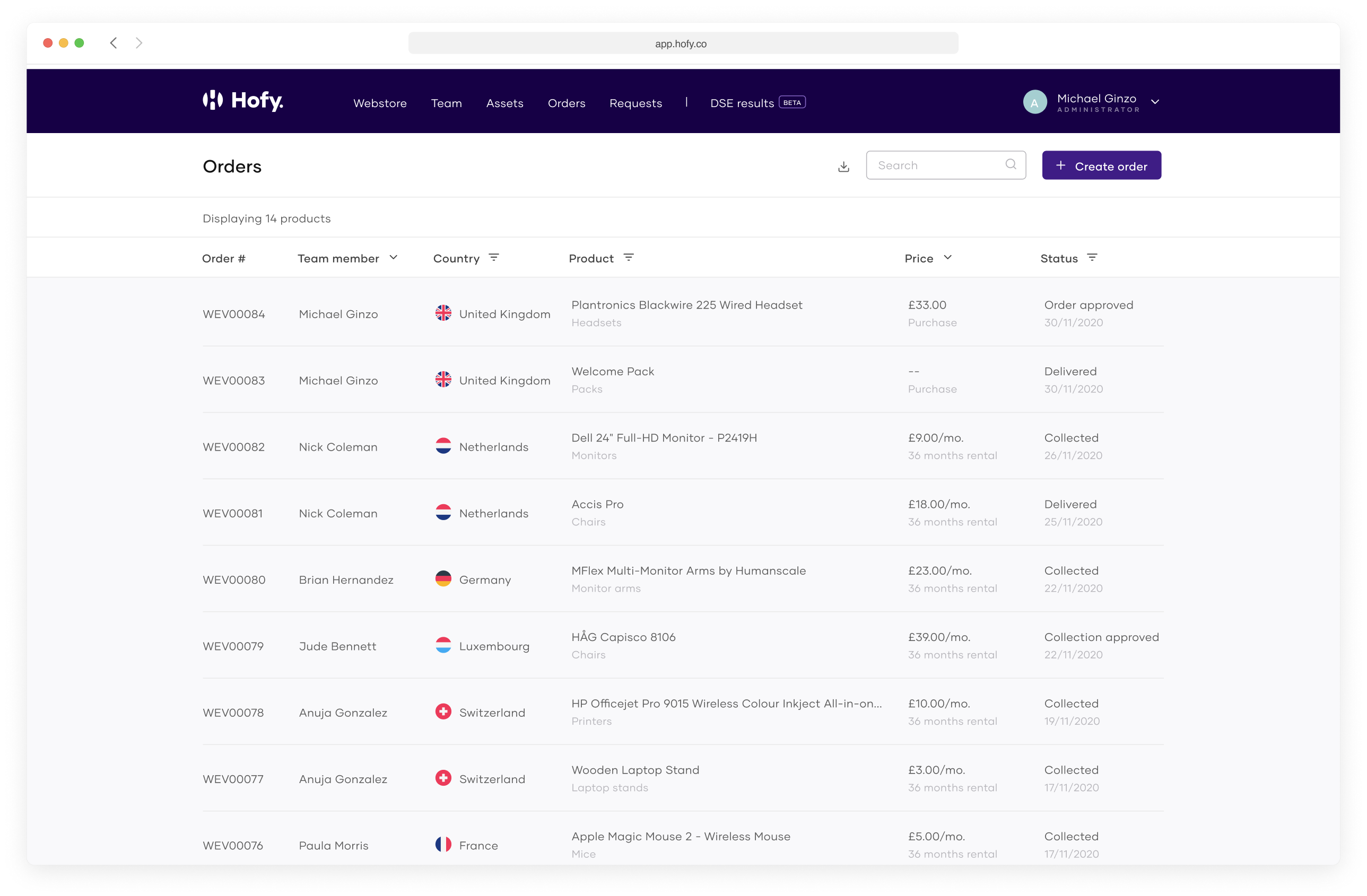 To create orders for team members, go to your Team view and select a team member to view their profile. You’ll see all the products they currently hold, as well as their budget status, within their profile. Click Create order to go to the Webstore.